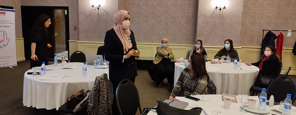 Sur invitation du Ministère de la Santé et en présence de Mme Anne Nicolay, attachée de coopération, santé et inclusion sociale de la DUE, le Dr Ezzeddine Mohsni, expert principal de l'AT a présenté le bilan de formation de la première phase I et les objectifs de la seconde. La Pr Inès Zakia Harzallah, coordinatrice nationale du programme, a partagé le bilan des demandes de formation des directeurs centraux et régionaux et les enseignements à retirer pour la suite des activités. Mme Nozha Moussa, directrice générale de l’UCFC a organisé le travail des groupes de réflexion thématiques en partageant la méthodologie de l'ingénierie de formation.